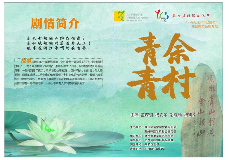 话剧《青青余村》以绿水青山为基础,以“两山”理念诞生地——湖州安吉余村的生态发展为原型,以村干部动员阿桂一家关闭采石场搬迁,将村子改造成生态度假村一事为故事主线,试图通过描写阿桂嫂一家人所面对的思考与困扰,纠结与抉择,鲜活的展现生活赋予每个人的辛酸苦辣,聚焦余村在生态发展过程中百姓的思想转变,展示“绿水青山就是金山银山”的真实写照。