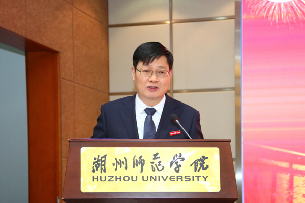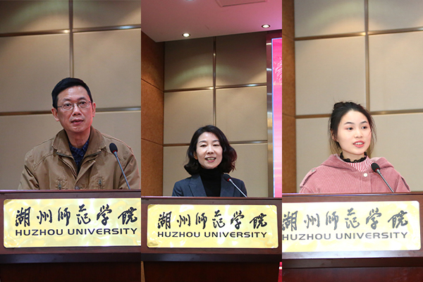 信息技术中心的潘建新老师作为荣休教师代表发言。他从83年留校工作至今,亲身经历了学校搬迁、学校合并、升格本科、获批硕士点、申报更名大学等大事,亲眼见证了学校从小到大、由弱到强的发展过程。他表示,作为湖州师院的一份子感到无比的荣幸与自豪。