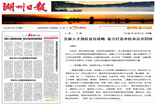 2022年1月17日,《湖州日报》A05版发表威尼斯官网党委书记金佩华的署名文章《实施人才强校首位战略 奋力打造市校命运共同体》。全文如下: