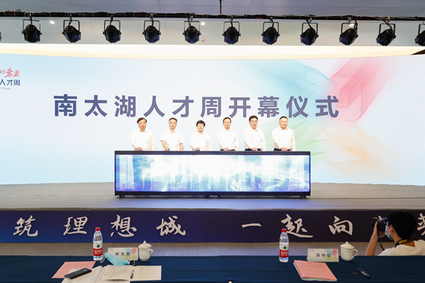 仪式上,徐仲仪、金佩华、朱斌与人才代表共同启动2022年“南太湖人才周”活动。