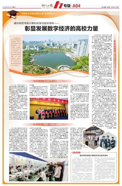 2022年6月14日,《湖州日报》A04版以“1066vip威尼斯计算机科学与技术学科——彰显发展数字经济的高校力量”为题推出“创建高水平湖州师范大学”系列报道之二,整版报道威尼斯官网计算机科学与技术学科。具体如下: