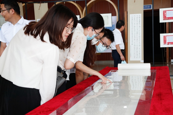在场师生党员一起参观了“喜迎二十大、奋进新时代”手抄党章作品展。