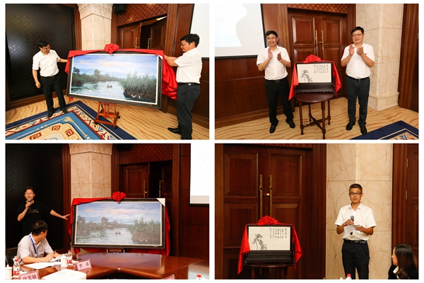 敖煜新与蒋云良共同为学校向德清县捐赠的油画《下渚湖晨曦》以及德清县回赠的缂丝作品揭幕。油画作者沈红泉老师和德清文旅体局局长朱海平分别对两幅作品作了介绍。