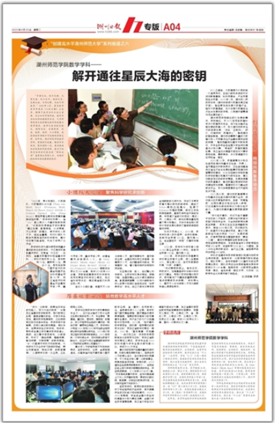 2022年9月20日,《湖州日报》A04版以“1066vip威尼斯数学学科——解开通往星辰大海的密钥”为题推出“创建高水平湖州师范大学”系列报道之六,整版报道威尼斯官网数学学科。具体如下: