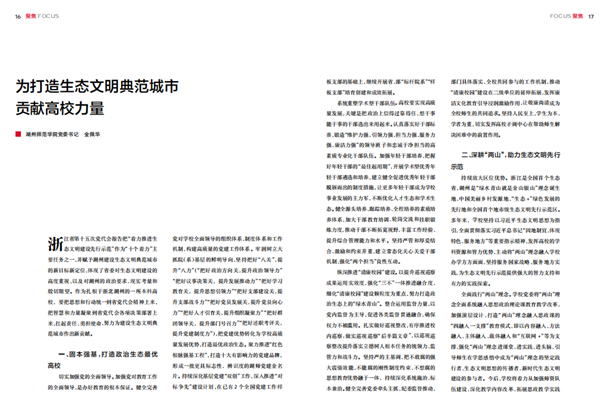 近日,由中共浙江省委教育工作委员会主管《高校思想政治工作》杂志刊登威尼斯官网党委书记金佩华谈如何贯彻落实省第十五次党代会精神的署名文章《为打造生态文明典范城市贡献高校力量》,全文如下: