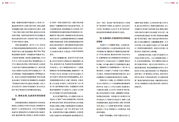改革创新培养路径。师范教育作为学校最亮的底色,必须坚定不移坚守和弘扬。持续推进“校地共育”人才培养模式改革,与中小学共建教师发展学校,聘请优秀中小学教师全程参与师范生培养,通过拜师学教、教育见习、教育研习和教育实习四年一贯的实践教学设计,构建“角色体验提前化”“技能训练全程化”的实践教学体系。成立基础教育集团,派驻教师赴中小学挂职,出台系列教师教育队伍建设校地合作协同培养计划,加强学校与地方政府、基础教育业界及省内外高校的互动合作,完善教师教育师资队伍与基础教育融合发展的机制。在浙江高质量发展建设共同富裕示范区的背景下,紧盯师范教育发展中的短板和弱项,以服务基础教育和农村教育为导向,大力发展乡村教育、小教定向、学前专科师资培养等。