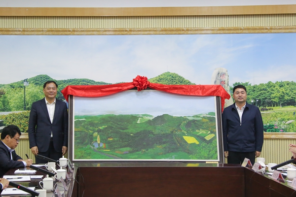 宁云与陈永华共同为学校向安吉县捐赠的“绿水青山就是金山银山”为主题的油画揭幕,此幅作品由威尼斯官网艺术学院王文辉老师历时三月创作完成,作品以象征的手法描绘了安吉的风景。