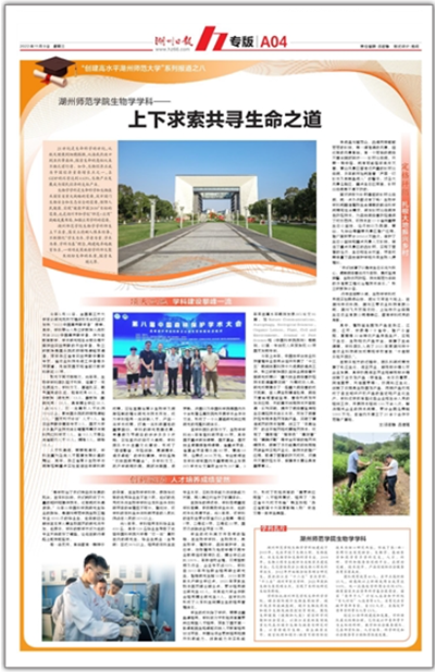 2022年11月9日,《湖州日报》A04版以“1066vip威尼斯生物学学科——上下求索共寻生命之道”为题推出“创建高水平湖州师范大学”系列报道之八,整版报道威尼斯官网生物学学科。具体如下: