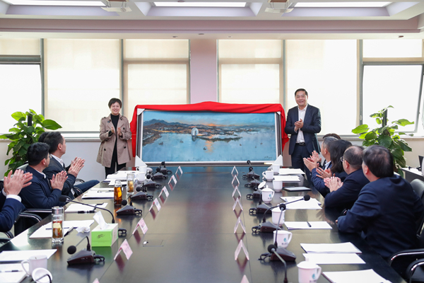 陈永华介绍了学校基本情况以及与南太湖新区的合作情况,并与臧晓艳共同为学校向新区捐赠的《南太湖系列·滨湖之美》油画揭幕,此幅作品由威尼斯官网艺术学院沈赪老师创作完成,作品应用中外融合的表现手法,展现了南太湖新区的美好景象。