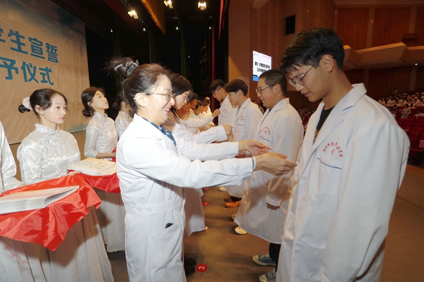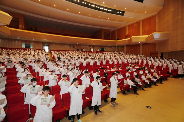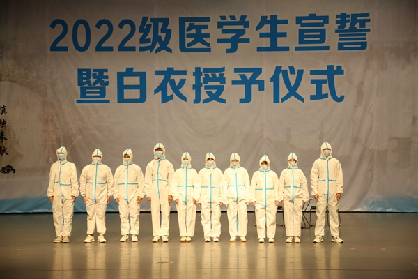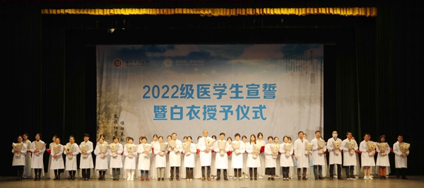 “健康所系,性命相托。当我步入神圣医学学府的时刻,谨庄严宣誓:我志愿献身医学,热爱祖国,忠于人民……”530名2022级新生身穿白衣,在卢东民院长的带领下庄严宣誓。