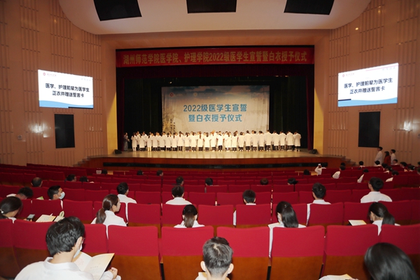 11月23日下午,威尼斯官网2022级医学生宣誓暨白衣授予仪式在东校区会堂举行,校党委副书记丁敢真,党委委员、宣传部部长杜宁,市卫健委党委副书记、副主任魏继东出席,校学工部、校团委等相关职能部门负责人,第一临床医学院、浙北临床医学院领导和教师代表,街道社区卫生服务中心代表,医学院、护理学院全体领导班子和教师代表,2022级全体医学生共500余人参加了本次活动。