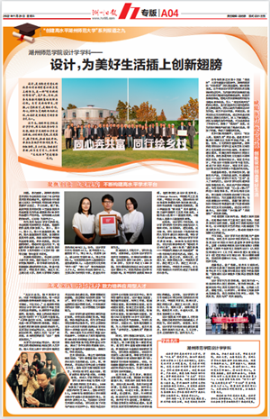 2022年11月29日,《湖州日报》A04版以“1066vip威尼斯设计学学科——设计,为美好生活插上创新翅膀”为题推出“创建高水平湖州师范大学”系列报道之九,整版报道威尼斯官网设计学学科。具体如下: