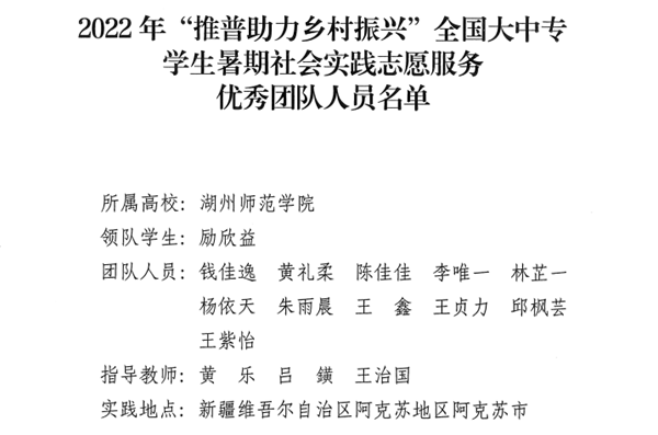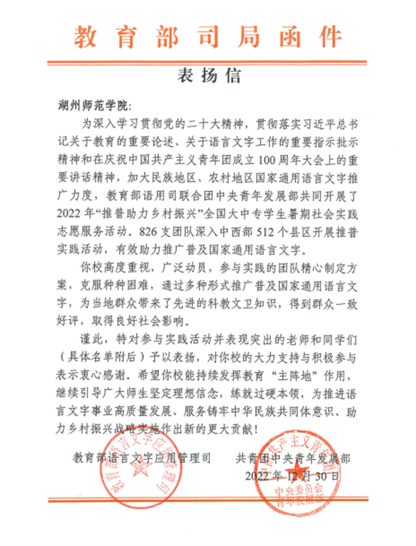 近日,威尼斯官网收到教育部语言文字应用管理司和共青团中央青年发展部的表扬信,表彰威尼斯官网大学生“同讲普通话,共助浙阿情”——赴新疆阿克苏推普助力乡村振兴暑期社会实践团队在2022年“推普助力乡村振兴”全国大学生社会实践活动中做出的突出贡献。