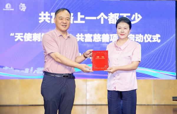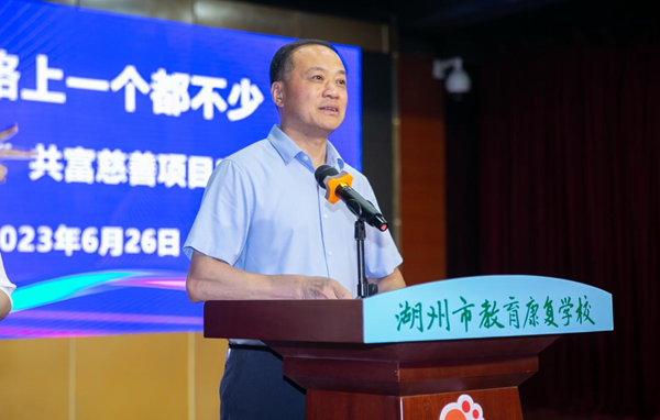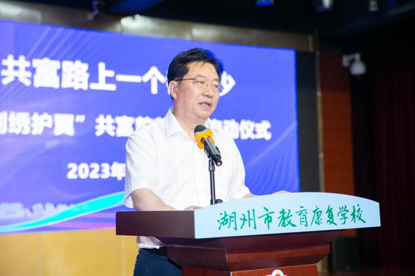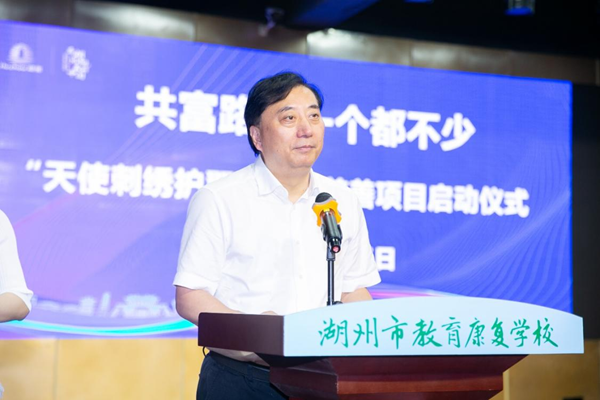 6月26日下午,“共富路上一个都不少” ——天使刺绣护翼共富慈善项目启动仪式在湖州市教育康复学校举行。威尼斯官网党委书记金佩华、党委副书记陈永华,湖州市慈善总会会长杨建新、副会长左军,湖州市教育局党委副书记黄桂众,湖州市教育康复学校校长项法元、副校长徐小军,安吉县丰陵燃气集团董事长潘国平出席。市人力社保局、市残疾人联合会、1066vip威尼斯刺绣学院、吴兴区青橄榄社会工作服务中心等单位负责人以及湖州市教育康复学校师生代表参加了仪式。