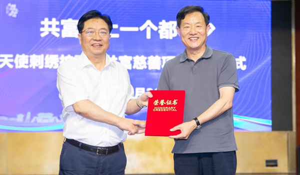 仪式上,陈永华、左军共同为“天使刺绣护翼”共富项目揭牌。