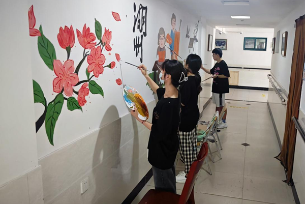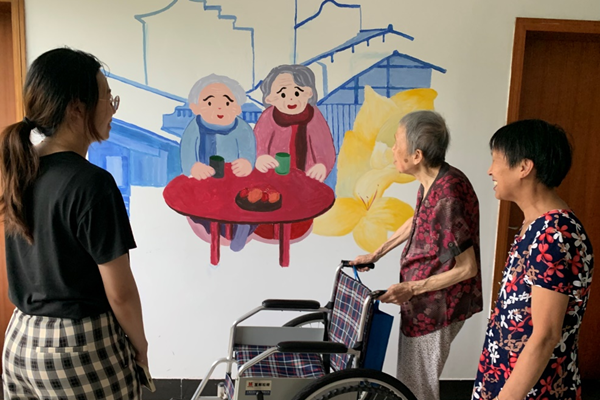 飞英塔、月亮湾、东吴双塔……队员们将湖州街景、建筑、美食等地域特色搬到了墙上,将美丽湖州展现在老人的眼前。实践团还以康复医院的老人为主角,勾勒出十余幅生动的日常生活场景,勾勒出“一墙一文化,一室一风景”,让康复医院的面貌焕然一新。医护人员与老人们驻足于墙前仔细地欣赏着,用手比划着向团队成员询问画中的景物与暗含的寓意。他们不住地点头,在一声声略带湖州方言的“好看”中,肯定了实践团的绘画成果。