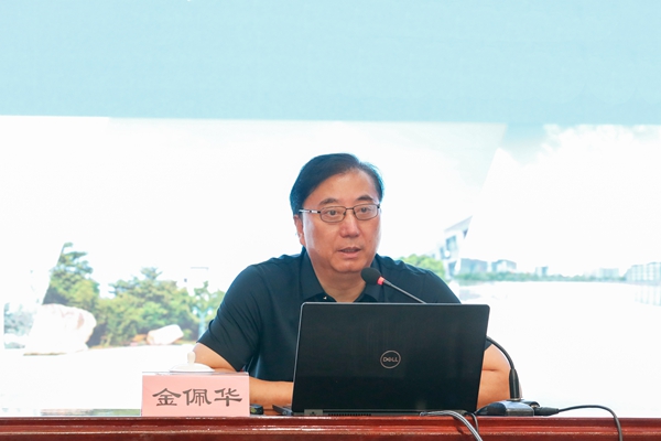 金佩华全面介绍了湖州“宜居宜学、人文荟萃、山水清远、生活便捷、社会和谐、值得期待”的优势特点,强调“城市因大学而兴,大学因城市而盛”,师院与湖州已经成为一个血脉相连、共生共荣的市校命运共同体,希望新教工树立“师院是湖州的,湖州是师院的”理念,以城市主人的心态拥抱湖州、热爱湖州、扎根湖州。他从学校校训“明体达用”思想提出者、北宋著名教育家胡瑗先生讲起,向新教工讲述了学校106年的发展历程、当前的建设成效和未来的发展规划,勉励新教工读懂师院,牢记2006年习近平总书记主政浙江期间来校视察时的重要指示精神,尽快融入学校,群策群力,在贯彻落实“3918”战略体系,大力推进“三步走”目标,全面建成“在国内有一定影响、一定水平、一定地位的湖州师范大学”征程中建功立业,共同续写学校未来。金佩华希望,新教工们能够秉持“明体达用”校训,以培养“六有”人才为目标,当好塑造学生品格、品行、品位的“大先生”。做学生的心灵之师、学问之师、品行之师,展现“大情怀”、钻研“大学问”、滋养“大人格”。秉持仁爱之心,爱生如己、教生如子、待生如友,积极探索具有湖师元素的“德、智、体、美、劳”五育并举育人品牌;潜心问道、审慎思辨,坚持“学生为本、学者为重、学术为要、学科为基的“四学”理念,把科研论文做到祖国大地上,为地方经济社会发展贡献智慧力量;学高为师、身正为范,在大是大非面前旗帜鲜明,在义利得失面前保持定力,以高尚的人格赢得敬仰,以模范的言行树立榜样。