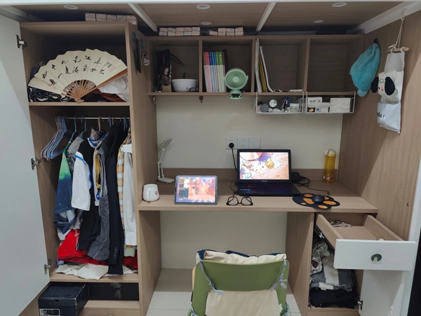 “一进寝室第一感觉是干净整洁,而且细节设计花了很多心思。寝室做了很多收纳设计,卫生间、淋浴房都是干湿分离的,学校很贴心地设置了自动饮水机,保障了热水供应。另外工作人员都特别友好,平时求助他们的时候总是第一时间给我们解决问题,让离家的孩子也能感受到归属感和温暖,我非常感谢他们。”艺术学院的任秋燕同学表达了入住新公寓的喜悦和感动之情。