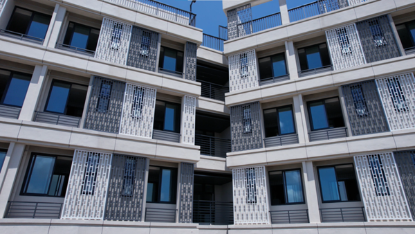 新建成的研究生公寓楼位于学校东校区,建筑整体呈开口朝南的元宝形,与南侧已建宿舍楼形成围合。建筑面积30429.23平方米,地上13层,地下1层。有590间公寓,可容纳2356人。配套生活服务中心在研究生公寓楼南侧,建筑面积2692.47平方米,地上3层。