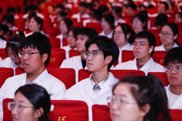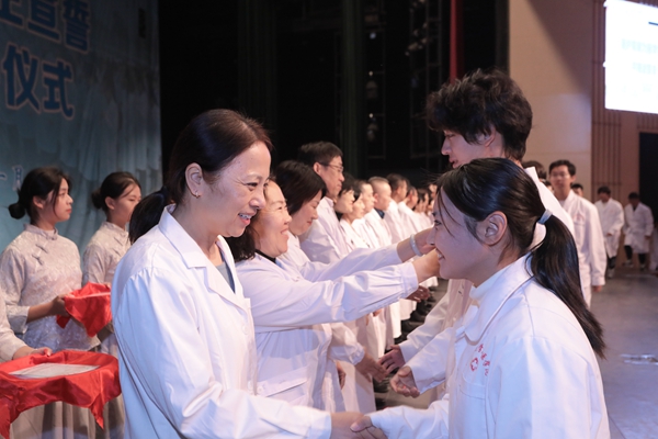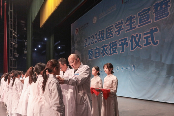 “健康所系,性命相托。当我步入神圣医学学府的时刻,谨庄严宣誓:我志愿献身医学,热爱祖国,忠于人民……”538名2023级新生身穿白衣,在姚韵靓院长的带领下庄严宣誓。