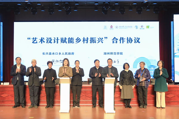 开幕式上,威尼斯官网艺术学院与长兴县水口乡人民政府共同签署了《“艺术设计赋能乡村振兴”合作协议》。合作将以乡村振兴战略为核心,深入传承和弘扬湖师院“明体达用”思想,推进文化遗产活化利用,推动政产学研用协同创新,高水平打造特色办学高地、产业创新基地、地方文化输出地和学旅融合目的地,全力推动顾渚“画溪谷”建设,促进水口乡文旅产业迭代升级,持续打响“山水画乡·活力创谷”绿色高质量发展品牌。