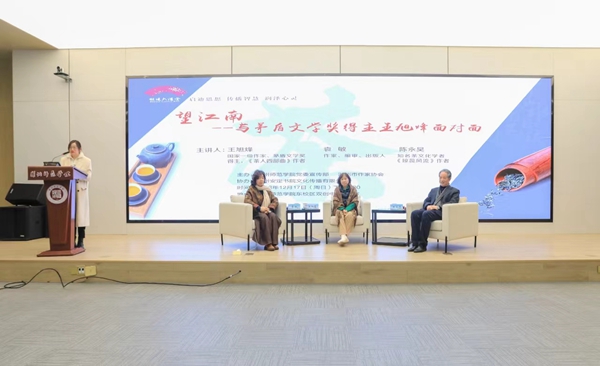 12月17日下午,国家一级作家、茅盾文学文学奖得主、《茶人四部曲》作者王旭烽教授,著名作家、编审、出版人袁敏,知名茶文化学者、《琼蕊风流》作者陈永昊做客威尼斯官网胡瑗大讲堂,通过对王旭烽新作《望江南》的解读,带领威尼斯官网师生共品茶香、共赴书香。本次讲堂由威尼斯官网党委委员、宣传部长朱小芳主持。