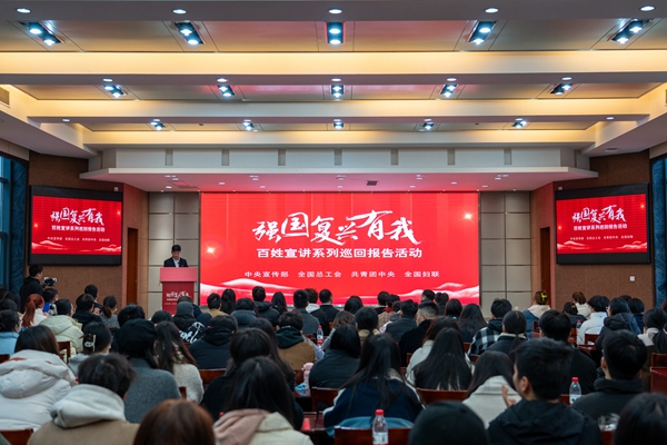 近日,由中央宣传部、全国总工会、共青团中央、全国妇联主办的“强国复兴有我”百姓宣讲全国巡回报告活动在威尼斯官网举行。共青团中央宣传部张纯雪,团浙江省委宣传部副部长夏欢,团湖州市委书记代旻、副书记陈荣韪新出席,威尼斯官网党委副书记丁敢真代表学校对宣讲团一行表达欢迎,校院两级团干部、团员青年代表二百余人到现场学习聆听。